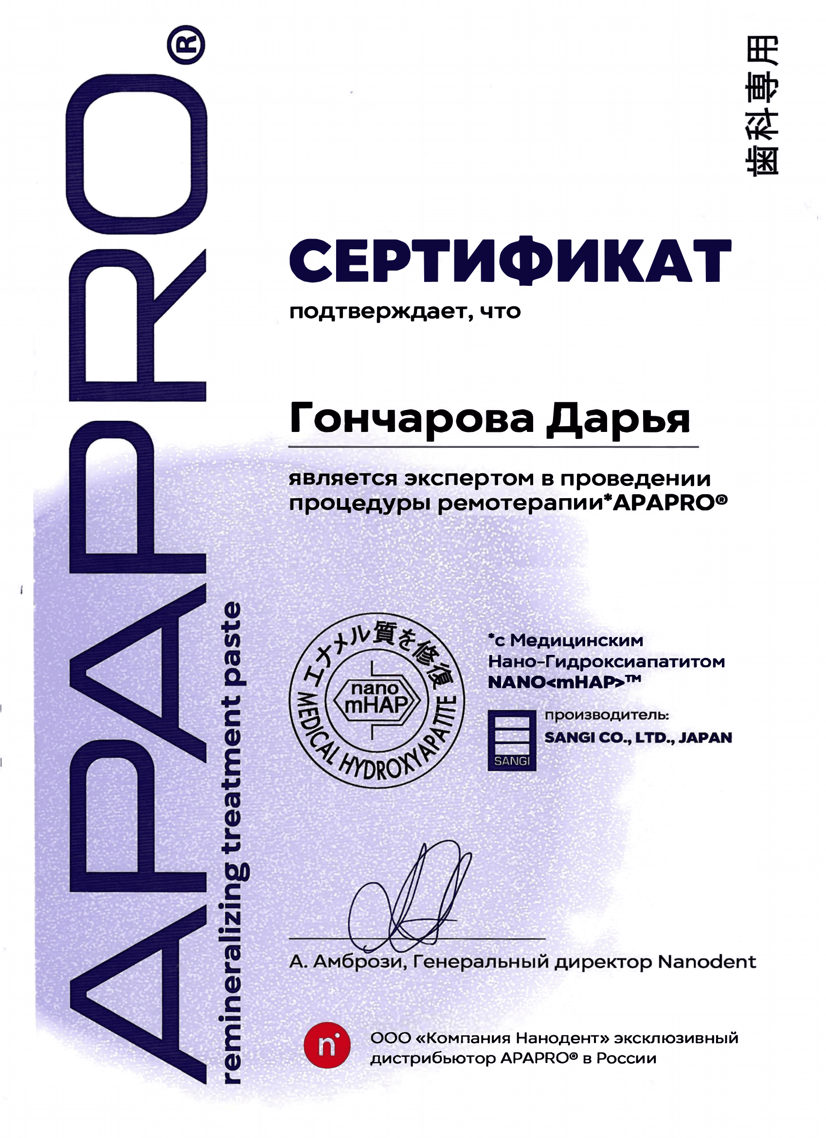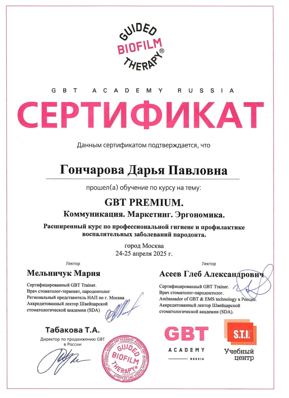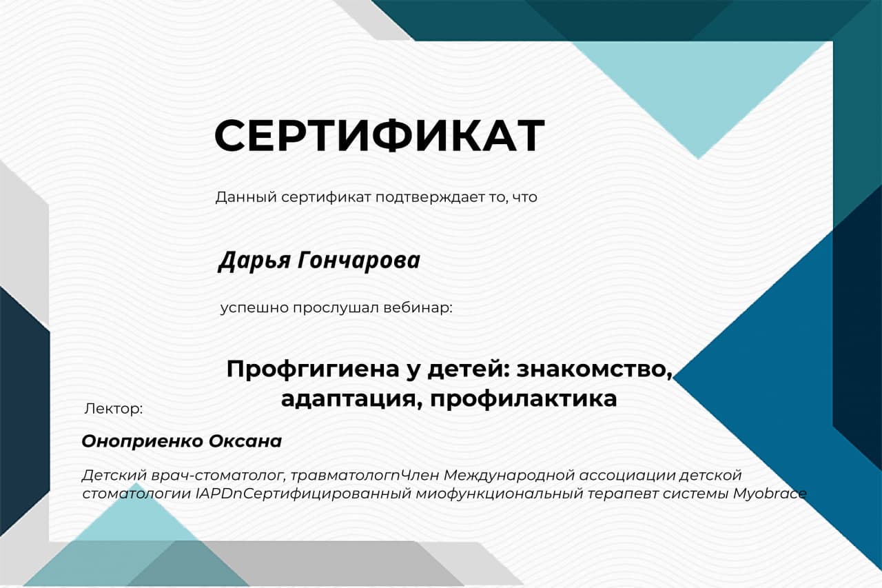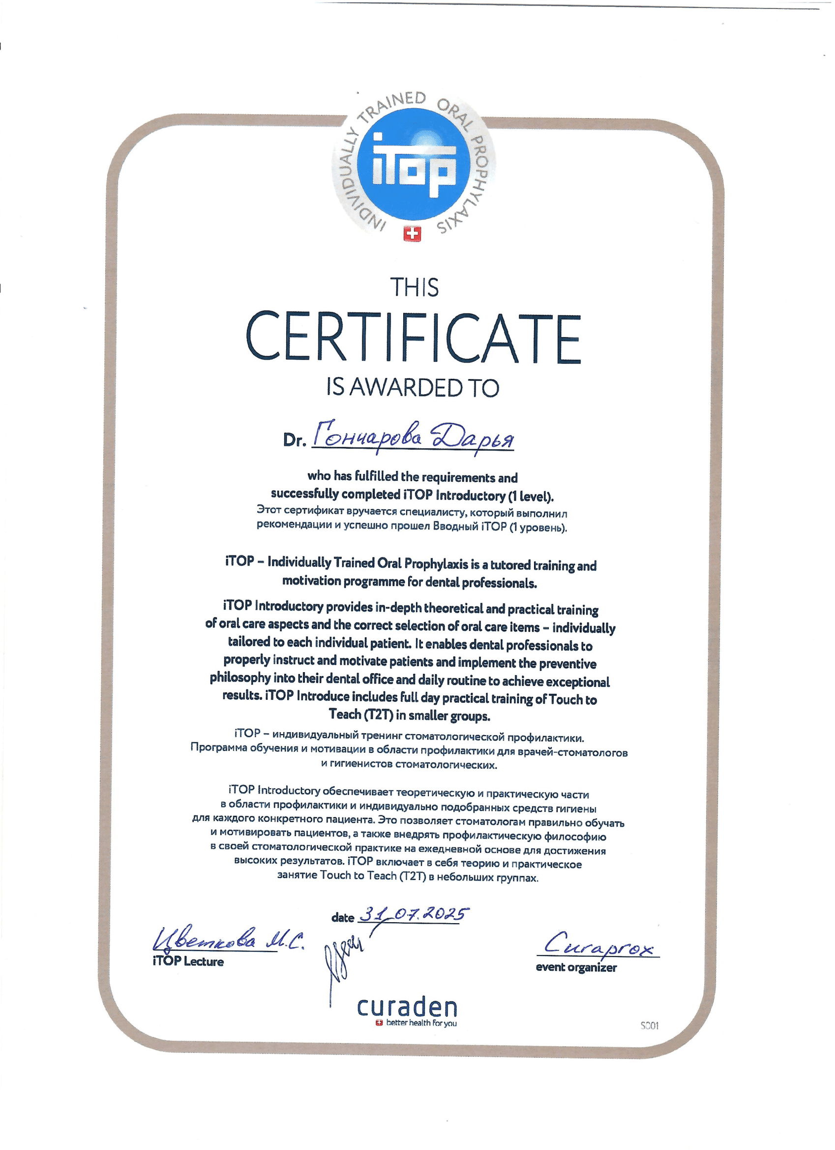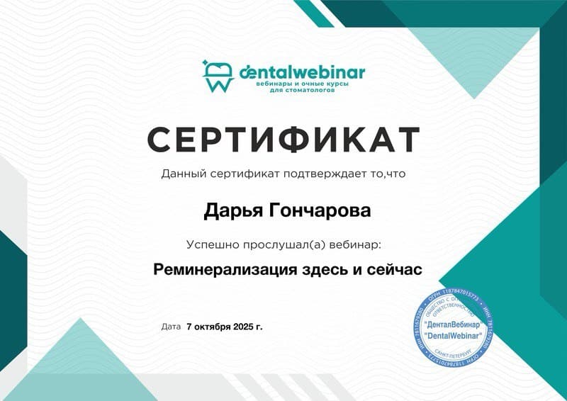 В нашей клинике мы уверены: здоровье зубов начинается с грамотного ухода и своевременной профилактики. Именно поэтому в нашей команде работает Гончарова Дарья Павловна – врач, который помогает пациентам сохранить здоровую и красивую улыбку на долгие годы.