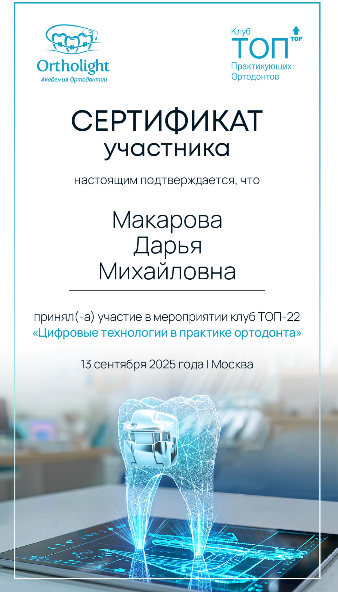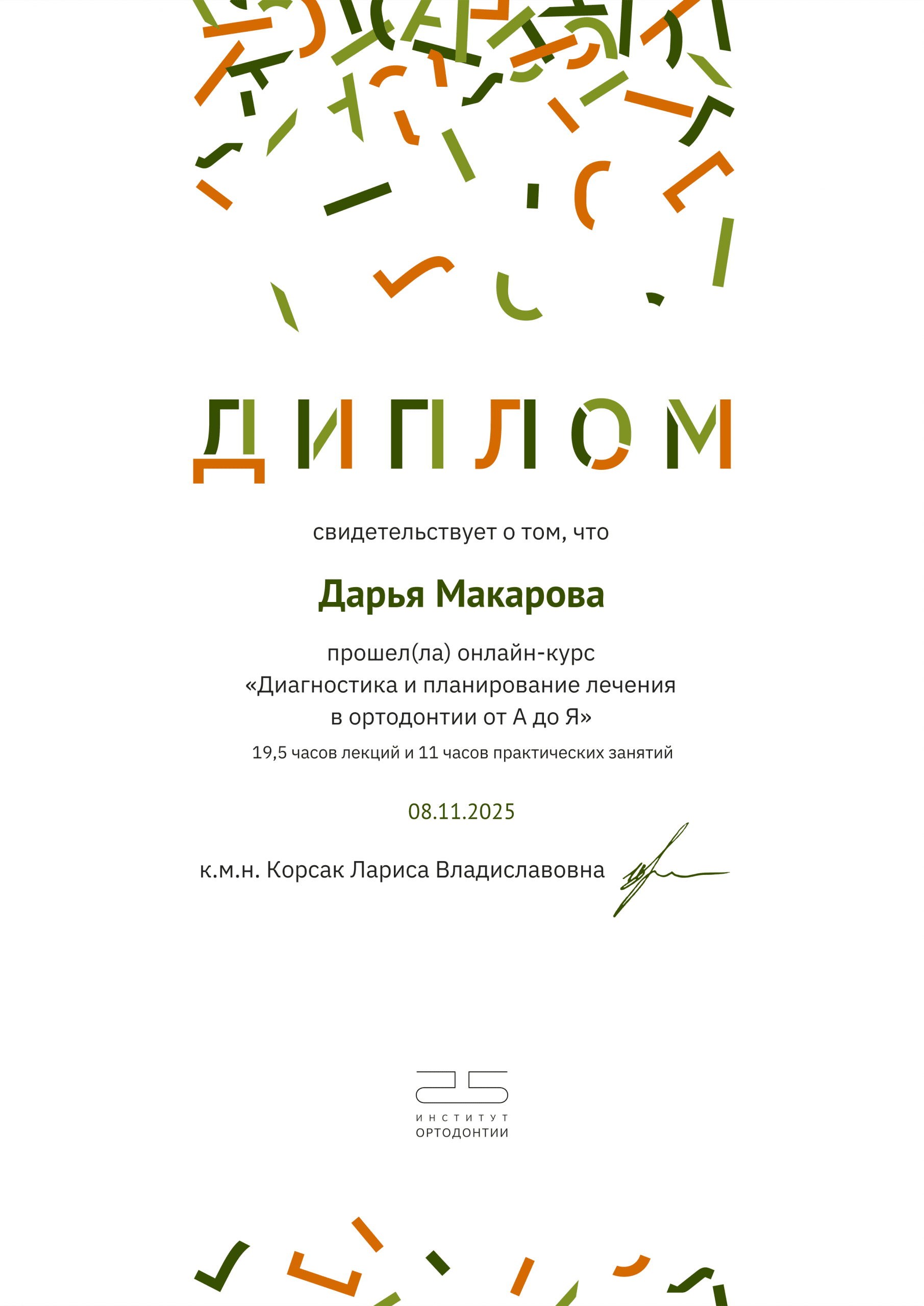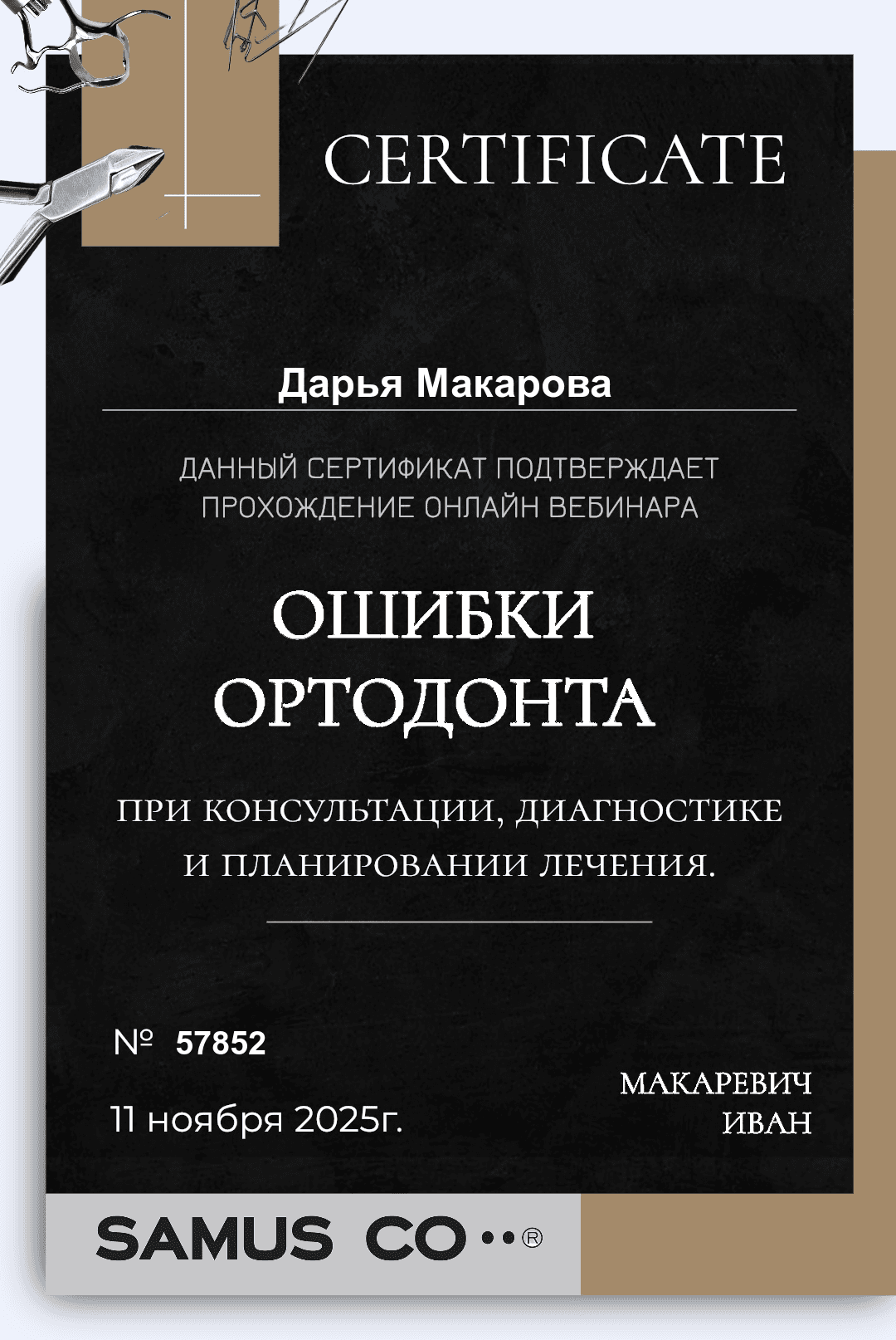 В нашей клинике мы знаем, что красивая улыбка — это не просто эстетика, а важная составляющая здоровья. Именно поэтому с нами работает Макарова Дарья Михайловна — ортодонт, который помогает пациентам обрести гармоничный прикус и уверенность в своей улыбке.